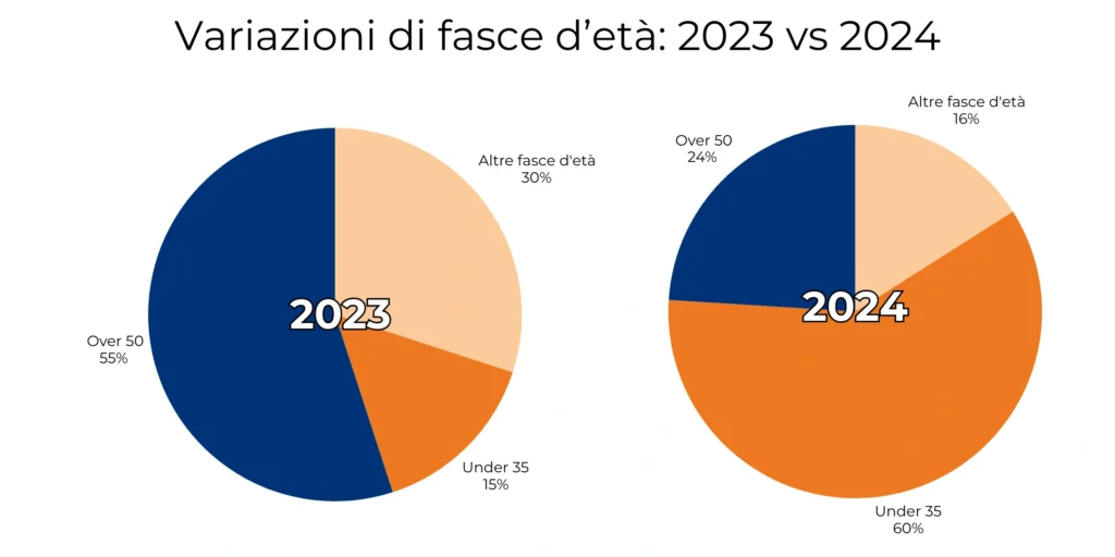 La fascia “18-35 anni” tra il 2023 e il 2024 ha avuto un incremento di quasi il 370%! Un cambiamento significativo nella distribuzione dei camminatori per fasce d’età, con una diminuzione dei camminatori nelle altre fasce d’età, a favore della fascia giovanile.