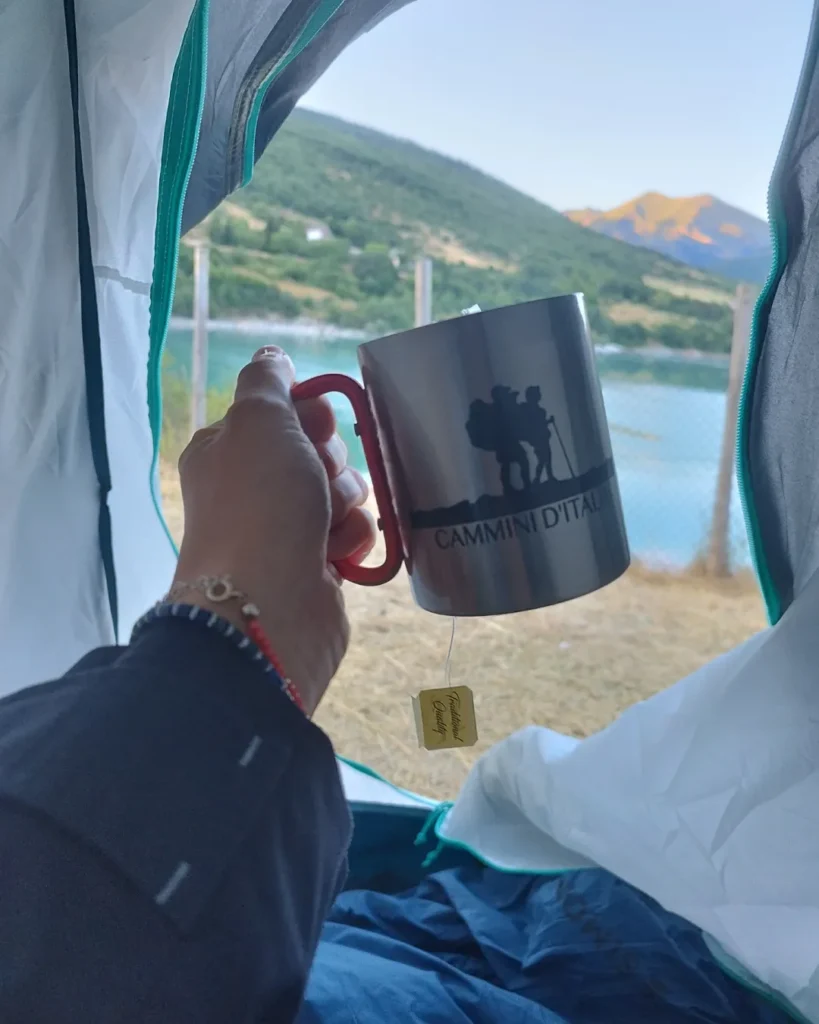 Ho scelto di percorrere il cammino in autonomia, con una tenda e soste nei campeggi. Tra i ricordi più belli c’è il campeggio sul Lago di Fiastra, dove ho fatto il bagno in un paesaggio da cartolina: il verde delle montagne che si rifletteva nell’azzurro del lago. I miei occhi si sono riempiti di ricordi che ho voluto fermare con gli acquerelli che portavo nello zaino. Qualcuno, esperto di cammini, avrebbe storto il naso dicendo che sono solo peso inutile…per me sono stati indispensabili.
