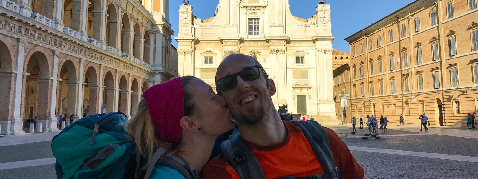 Da lì, all’improvviso il mare e la riviera del Conero ci appaiono in tutta la loro bellezza: il monte, Sirolo, Castelfidardo e tutti i paesini arroccati sulle colline. Attraversiamo il centro di Recanati, poi, dopo un’altra lunga discesa, arriviamo nella parte bassa del paese di Loreto. Ci aspetta l’ultima salita che ci mette alla prova e, finalmente, varchiamo Porta Romana ed entriamo a Loreto.