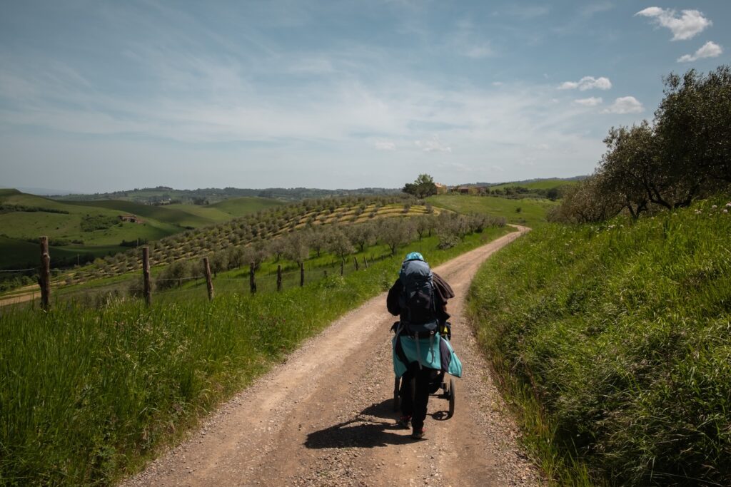 Sicuramente il percorso: bisogna studiarselo bene, guardando le mappe e affidandosi a una guida ufficiale per capire quanto sia fattibile con un passeggino. Nessuno te lo dice in modo esplicito: devo cercare di dedurlo io dal tipo di sentiero, dalle pendenze… In questo modo mi faccio un’idea, ma capita comunque che ci siano dei tratti difficili da percorrere: a volte, anche per pochi metri, il passeggino non riesce a passare e allora va trovata una deviazione. In due è più facile gestirlo, ma è capitato anche di chiedere una mano ad altri camminatori per passare un guado. L’anno scorso per esempio, sulla Francigena: per fortuna è un percorso molto frequentato e non è stato difficile chiedere aiuto. Le difficoltà più classiche si acuiscono, come accade per esempio con la pioggia: quando si crea il fango, fisicamente si fa più fatica a spingere un passeggino. In generale, poi bisogna riuscire a motivare la bambina, tenerla impegnata.