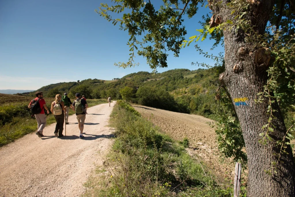 La natura dell’Appennino marchigiano fa da sfondo generoso: colline sinuose, paesaggi variopinti, una vegetazione lussureggiante che avvolge i camminatori.