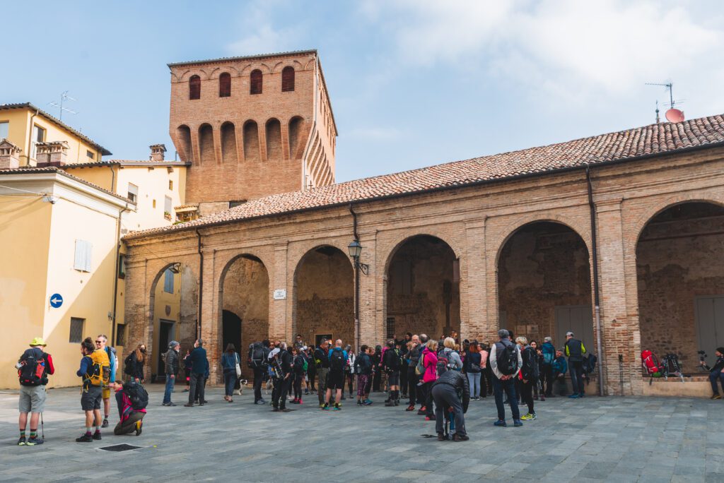 L’inizio del Cammino non poteva conoscere un luogo più suggestivo. Siamo a Vignola, in Piazza dei Contrari. Lo sguardo incollato al Castello perfettamente conservato evoca tempi lontani. C’è silenzio, ci siamo già allontanati dal vortice della vita.