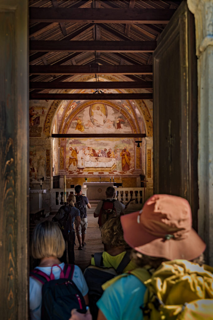 L’ultima tappa del percorso è breve e in discesa, accompagnata da un ritmo lento e dalla quiete della campagna. A Valeriano, fermati per scoprire i vini autoctoni riscoperti di recente, da gustare direttamente nel luogo che li ha generati. Visita anche la Chiesa dei Battuti, riconoscibile dall’imponente affresco di San Cristoforo sulla facciata, con altre opere rinascimentali all’interno, tra cui quelle di Giovanni Antonio de Sacchis, detto “il Pordenone”.