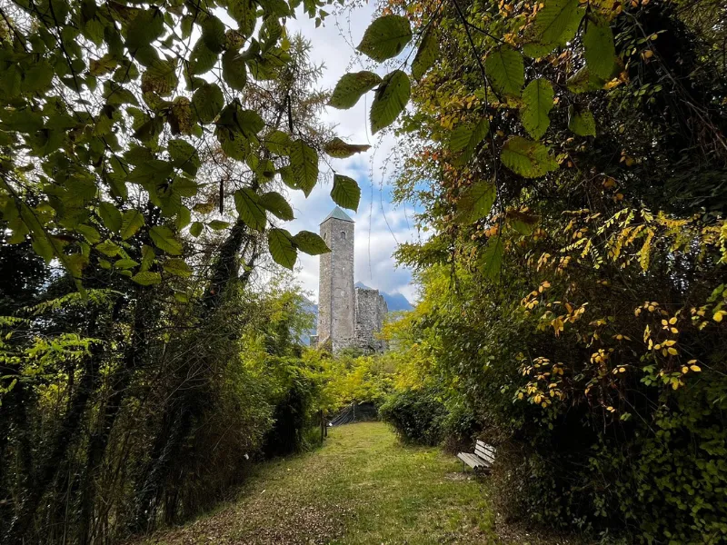 Cappella dell’Annunziata: costruita nel 1931, ospita un dipinto dell’Annunciazione di Marco Bertoldi (1993), con Santi Vigilio e Antonio da Padova. Dopo un tratto panoramico sulla catena della Vigolana, si arriva a Campregheri, piccolo borgo con un bar accogliente proprio all’ingresso. Ottimo punto per una pausa prima della discesa. Si scende così verso la Torre dei Sicconi, antica fortificazione costruita nel 1201 dai signori di Caldonazzo. Distrutta nel 1385 e poi fatta saltare dal Genio militare austriaco nel 1915, oggi è un sito archeologico con giardino botanico e vista sulla valle. Un luogo che racconta la storia bellica e feudale della zona. Si raggiunge poi la Magnifica Corte Trapp, residenza nobiliare dal 1462, dove i Conti Trapp amministravano la giustizia. Oggi è sede di eventi, concerti e mercatini. Il decimaio a doppio colonnato e la sala nella roccia sono ambienti suggestivi, perfetti per una sosta culturale.