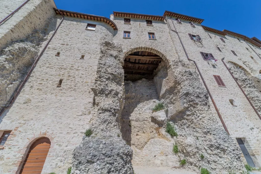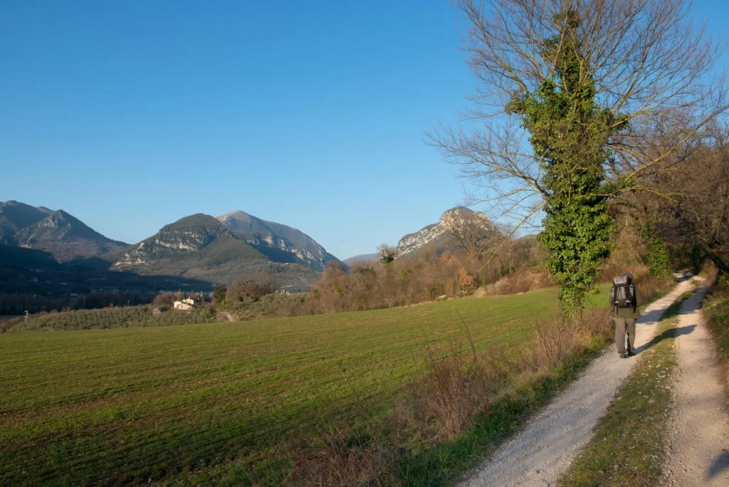 Il cammino si snoda tra colline panoramiche affacciate sulla valle spoletana, lungo un itinerario di circa 12 km che alterna oliveti ordinati a campi aperti, piccoli centri abitati ed eremi silenziosi. Siamo nel cuore della Fascia Olivata Assisi-Spoleto, riconosciuta come“paesaggio culturale vivente”, ovvero un’opera “combinata della natura e dell’uomo”. Da Trevi al castello di Poreta, la tappa è adatta a tutti, ma le continue salite e discese richiedono un passo lento, regolare, e qualche sosta rigenerante lungo il tragitto. Si parte in discesa da Trevi, fino a raggiungere il Monastero della Madonna delle Lacrime — informarsi sugli orari d’apertura — dove si lascia la strada asfaltata per entrare su un sentiero panoramico. Si attraversa il piccolo abitato di Alvanischio, per poi risalire lungo un tratto immerso negli uliveti terrazzati. Qui l’intervento dell’uomo si fonde con il paesaggio: i muretti a secco, curvati ad arco come lunette di pietra, testimoniano una delle opere di ingegneria agricola più complesse e affascinanti dell’intera area mediterranea, realizzate per coltivare l’olivo in un ambiente difficile ma fertile. Si raggiunge quindi una fonte d’acqua in località I Camponi, utile per una sosta, e da lì si prosegue prima su asfalto, poi su strada sterrata fino a un antico monastero. La vista si apre poi sulle mura bianche del castello di Campello, che si stagliano con eleganza sul paesaggio collinare. Una sosta a Lenano permette di rifornirsi d’acqua, mentre il cammino continua in discesa, accompagnato da piccole edicole votive dedicate alla Madonna, segni di devozione popolare che punteggiano il percorso con discrezione e spiritualità. L’arrivo a Poreta segna la fine della tappa. Per chi ha ancora energie, è possibile salire fino al castello di Poreta, che domina la zona e sarà protagonista dell’inizio della tappa successiva.