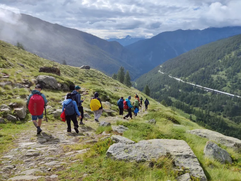 Dopo l’immancabile visita al museo dell’Ospizio e all’attiguo canile in cui vengono allevati i campioni della razza San Bernardo, ci incamminiamo verso il confine.Da qui ci aspetta una mulattiera panoramica che scende gradualmente verso valle, seguendo il segnavia 103.