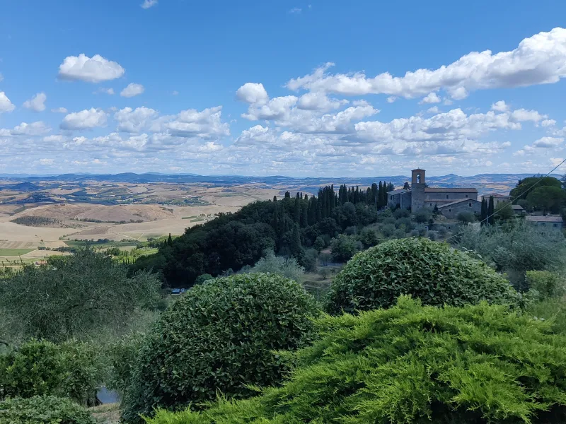 Percorriamo un tratto di sentiero parallelo alla provinciale per Montalcino, che lasciamo per entrare nei panorami da sogno della Val d’Orcia, lungo un percorso per strade bianche che ci porta a Torrenieri. Da qui utilizziamo un tratto della Cassia dismessa, purtroppo ancora asfaltata, e poi una bella strada sterrata per raggiungere San Quirico, che ci accoglie con la sua splendida collegiata.