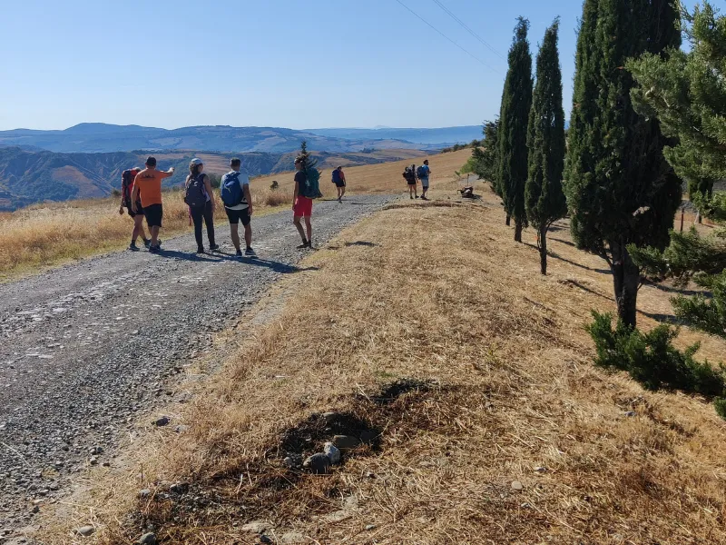 La discesa da Radicofani lungo la vecchia Cassia è uno dei tratti più belli ed emozionanti dell’intera Via Francigena: attorno a noi colline a perdita d’occhio e il Monte Amiata, e dietro di noi la Rocca.