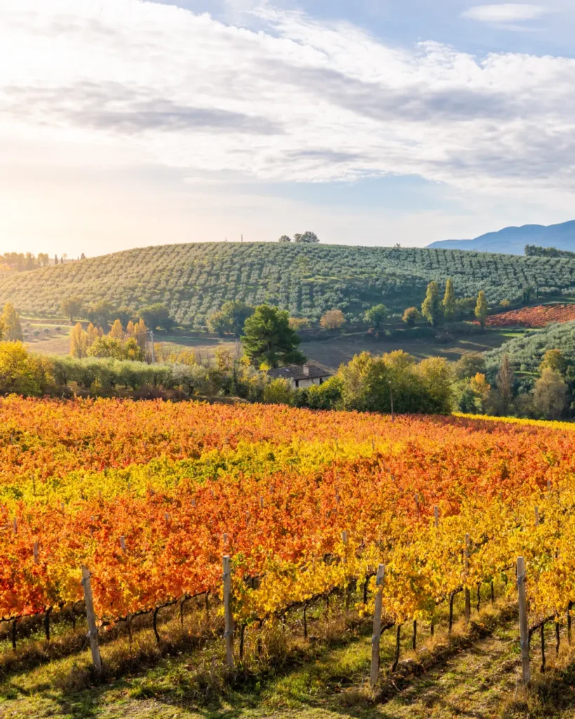 Le colline umbre si tingono: le viti virano al rossastro, gli olivi diventano argentati, i boschi di querce e carpini giallo-arancio. È una tavolozza calda, mediterranea, che rende ogni curva del sentiero una piccola sorpresa.
