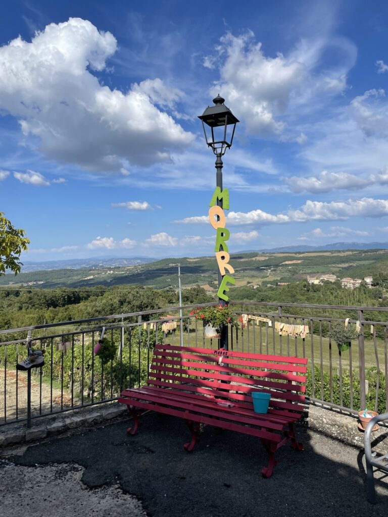 E poi, come sempre, dopo la salita c’è sempre la discesa, a volte anche più difficile. La strada continua, i chilometri iniziano a farsi sentire, lo zaino a pesare.. così decidiamo di fermarci e cucinare con il nostro fornellino un piatto di pasta. Riprendiamo le energie e, dopo qualche chilometro tra salite e discese, raggiungiamo Morruzze. Un borgo veramente silenzioso dove potrai riposarti e goderti il momento sulle panchine che affacciano su un bel panorama. Proseguendo, quasi giunti alla fine della seconda giornata, raggiungiamo Morre dove, perdendoti tra i suoi vicoli, potrai bloccare un tuo ricordo insieme a quello degli altri viandanti su una targhetta di legno.