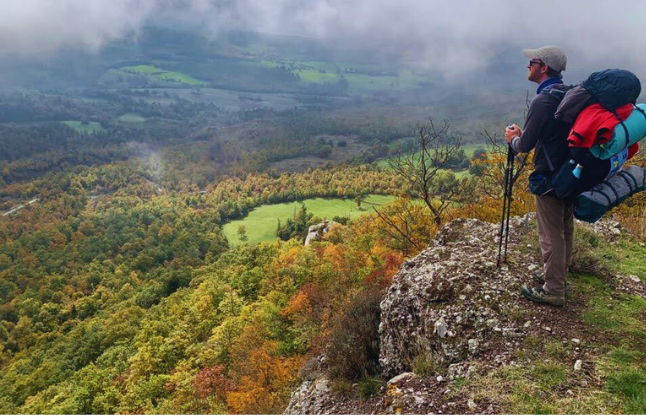 Ripartiamo nel pomeriggio: il sentiero torna a salire e finalmente le nuvole si aprono, lasciando spazio a scorci spettacolari. Raggiungiamo il monte Verde (1.147 m), poi il cammino prosegue in un susseguirsi di saliscendi fino al Pian della Capanna. Il rifugio in questo periodo è chiuso, ma come concordato con il gestore possiamo piantare le tende lì accanto. La giornata si conclude sotto il cielo limpido, in quell’alternanza di fatica e gratitudine che solo il cammino sa regalare.