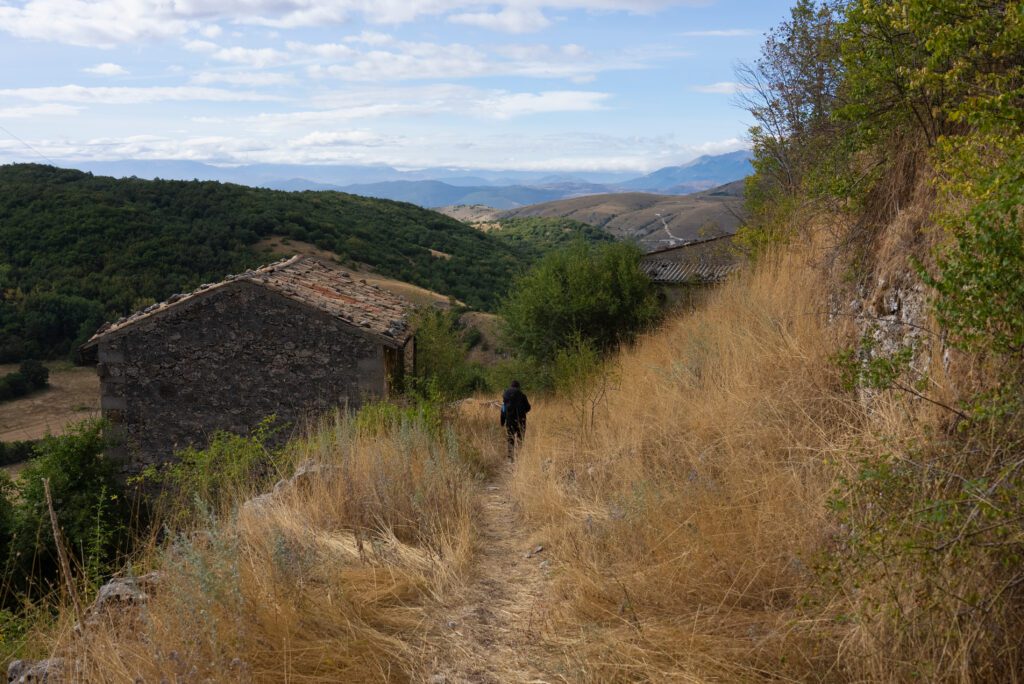 I primi passi sul sentiero ci regalano subito una vista spettacolare sugli altri massicci abruzzesi, come il Sirente e la Majella, ma soprattutto l’immediata percezione di trovarci in un luogo dove uomo e natura hanno una connessione molto antica. Vecchie strutture ora abbandonate sono sparse ai margini dei campi, muretti a secco coperti dalla vegetazione e ampie zone di pascolo, raccontano molto sul passato di questo territorio.