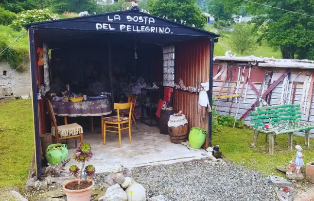 Circa un chilometro prima di arrivare, colta dalla pioggia, mi sono riparata in una particolare sosta del pellegrino dal nome Casa Fiorita, ricolma di bambole, pupazzetti di ogni genere, spaventapasseri e anche qualche dono per i viandanti.