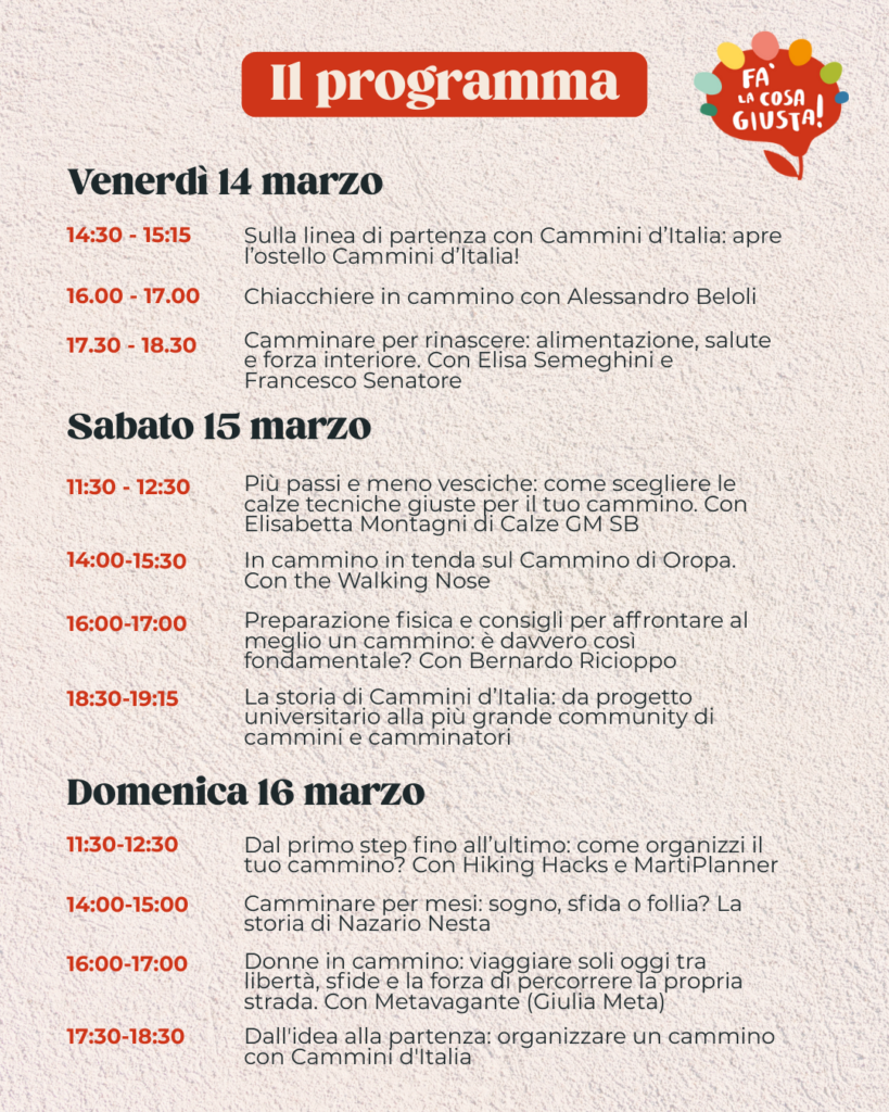 Quest’anno ti aspettiamo lì, dal 14 al 16 marzo 2025, alla Fiera dei Grandi Cammini, dentro Fa’ la cosa giusta!. Saranno tre giorni pieni di incontri, storie e dritte per chi ama mettersi in cammino, che sia a piedi o in bicicletta. Perché a volte basta poco per sentirsi parte di qualcosa di grande. E questo è il momento giusto per farlo.
