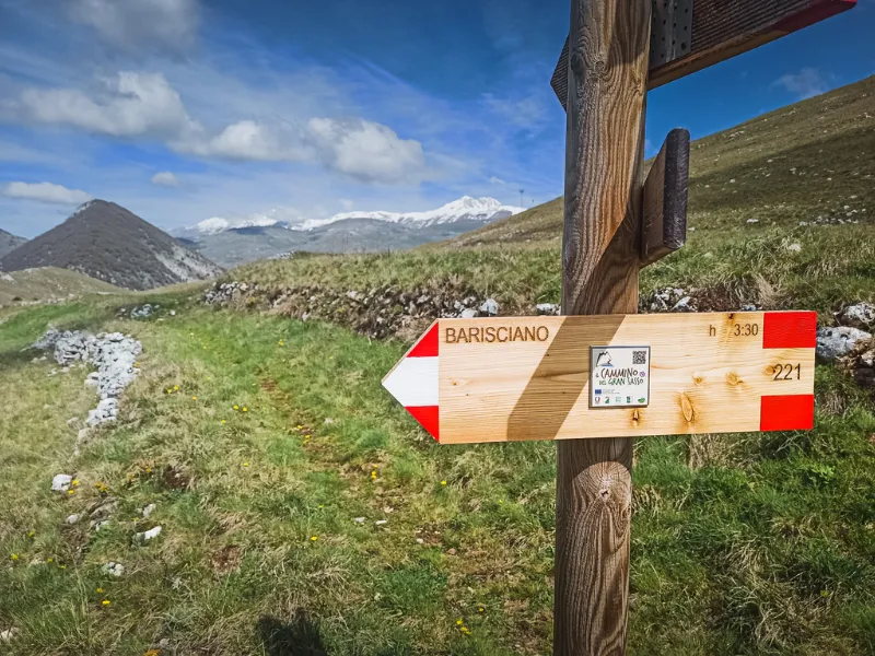 Signage present along the path following CAI standards with the addition of the Logo of the Cammino del Gran Sasso.
