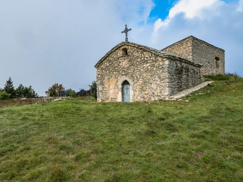 We proceed slightly uphill for most of the stage, crossing a valley that takes us to a fork with a small lake, Fonte Vedice, used for watering grazing animals. From here we follow in a northwesterly direction a slightly uphill cart track that will lead us to the lonely and silent Tempietto di Sant’Eusanio (1402 m).