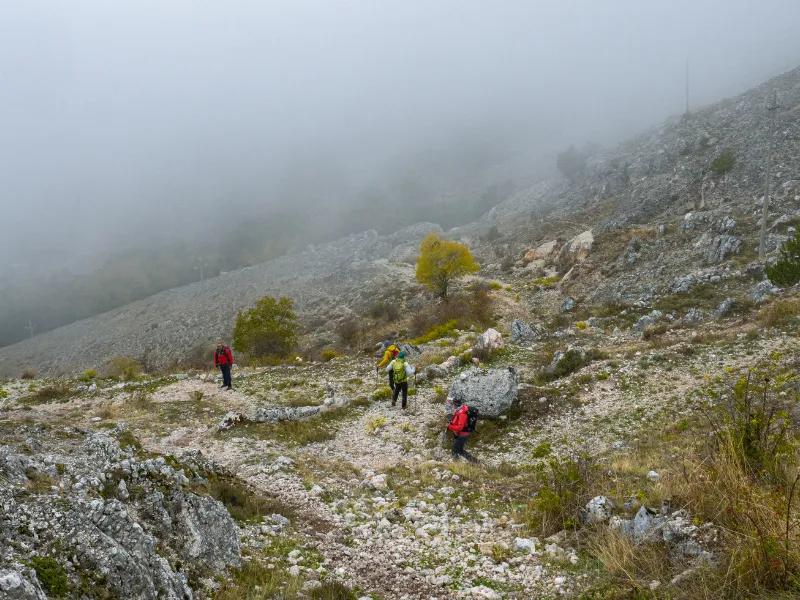 We walk on trail for five kilometers and overlook the valley located to the south, elegantly and geometrically shaped by terraces once cultivated with lentils and cereals such as spelt, Solina wheat, Rosciola, and Saragolla, the only floristic species that could withstand these altitudes.
