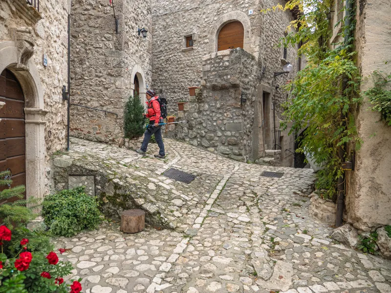 After scouting out every enchanted glimpse of Santo Stefano di Sessanio (1251 m) we set off, backpack on our shoulders, to tackle the fourth stage of Cammino del Gran Sasso, which, mostly downhill, will take us to Barisciano (940 m), which preserves some architectural glimpses from the 16th century, evidence of the presence of the Caracciolo family. Here we can visit the small church of Buon Consiglio or Capo di Serra dating back to the 13th century and decorated inside with valuable votive frescoes.