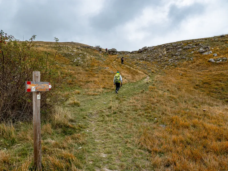 Following the Cammino signs, we head south along a cart track that runs alongside the provincial road. We pass cultivated fields and farms until we climb toward Colle della Battaglia (1180 m). An ancient settlement of the Italic Vestino people, Colle della Battaglia was completely destroyed in 324 B.C. by the Roman Consul Brutus Sceva; today only a few traces of the triple walls that defended the settlement are visible.