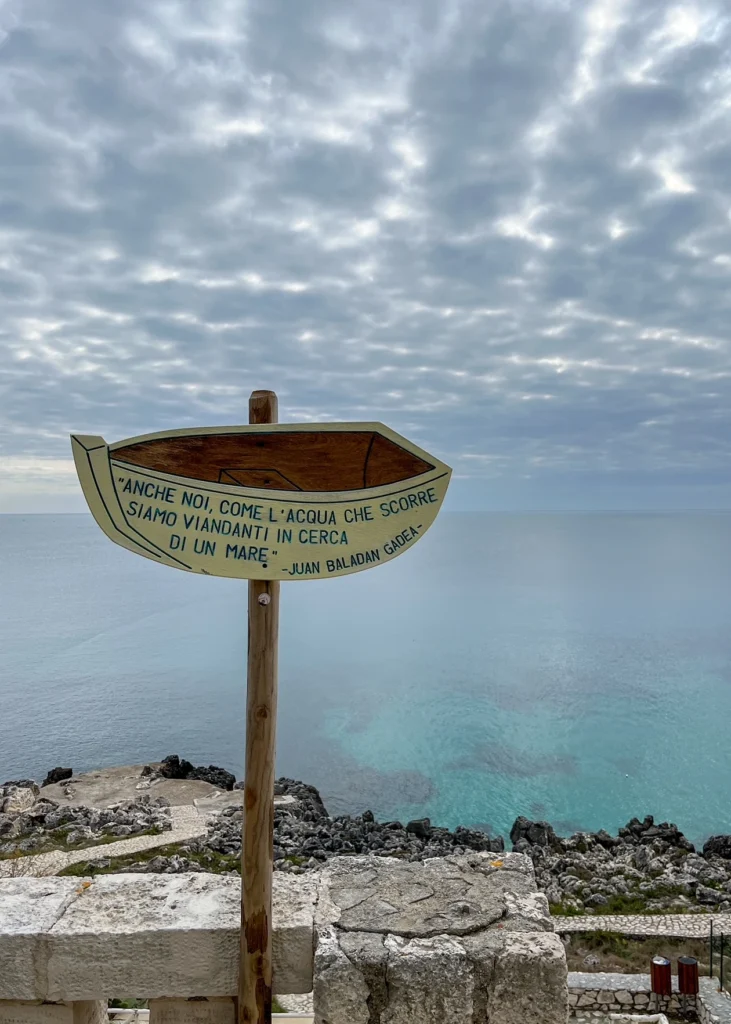 Oggi sul percorso ho la fortuna di vedere il Palazzo Serafini-Sauli di Tiggiano, il Palazzo feudale Capece di Corsano, le torri costiere di Marina di Novaglie. Il pezzo di cammino più suggestivo è però stato il sentiero delle Cipolliane, con le sue grotte e il Ciolo, il fiordo più bello del Salento, con il suo ponte che unisce le due sponde delle rocce.