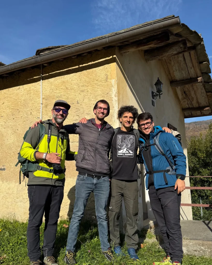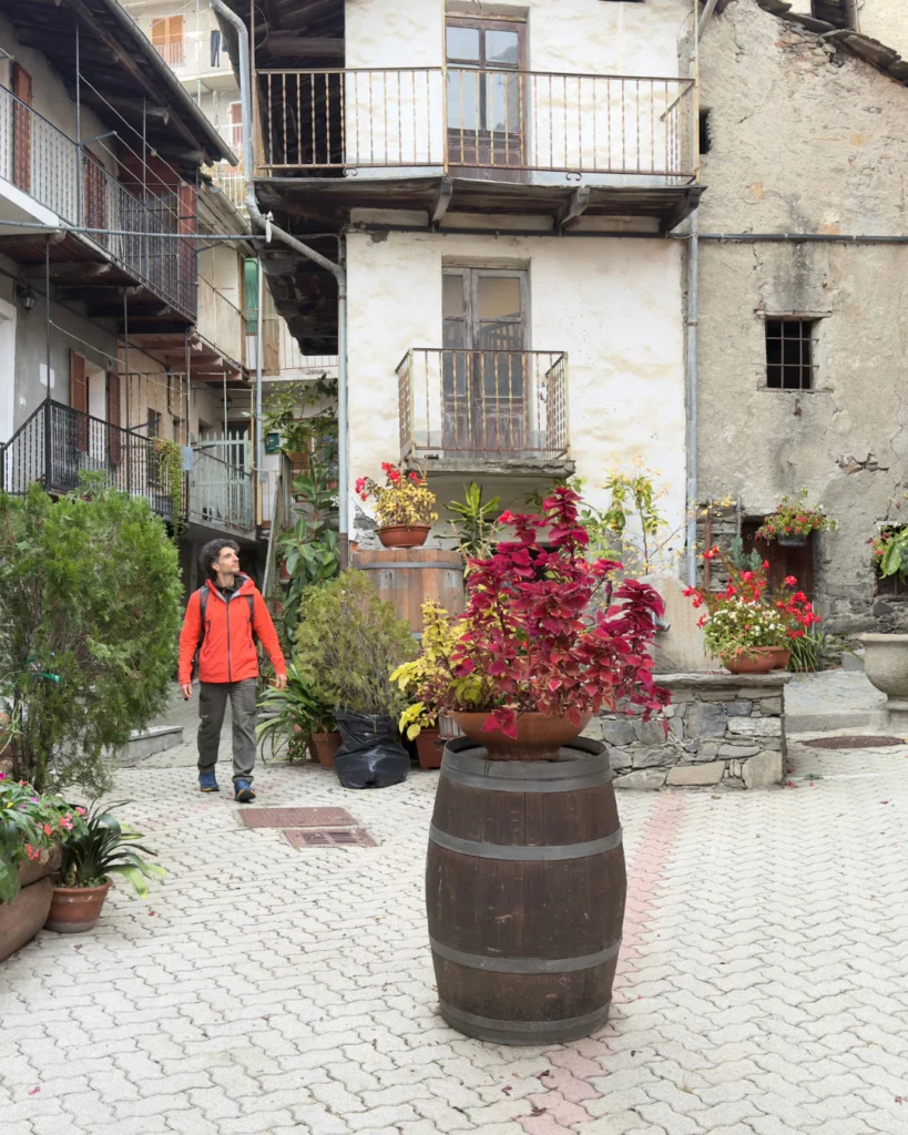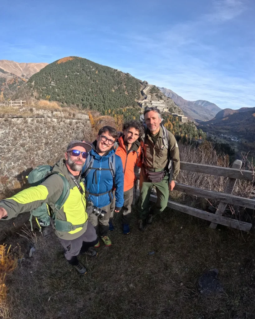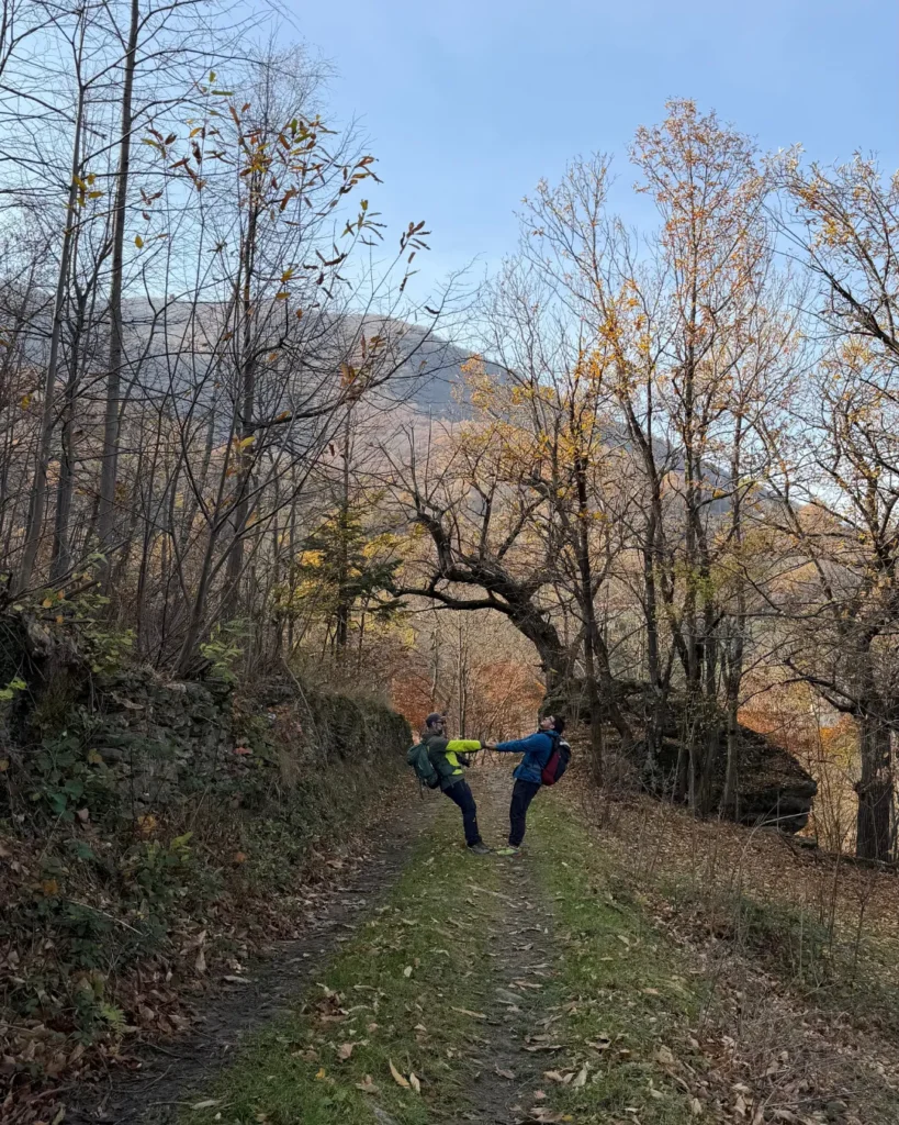 Presi dai racconti ci incamminiamo con lui per un po fino a quando ci saluta per poter andare a lavoro. La tappa continua tra boschi e piccole borgate simili a Pomaretto come Vignal e Villaretto. Mentre proseguiamo il cammino imbocchiamo un tratto di bosco davvero piacevole, che segue l’antica via dei Romani e ci porta fino a Mentoulles. È qui che arriva la sorpresa: da una casa affacciata sul sentiero… ricompare Bruno! Stavolta ha cambiato “divisa” e lo ritroviamo nei panni di guardiaparco delle Alpi Cozie. A quel punto capiamo che, oltre a essere memoria viva di queste valli, è anche uno di quelli che le custodisce ogni giorno.