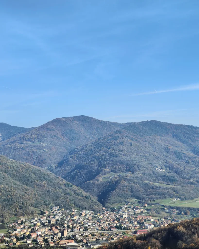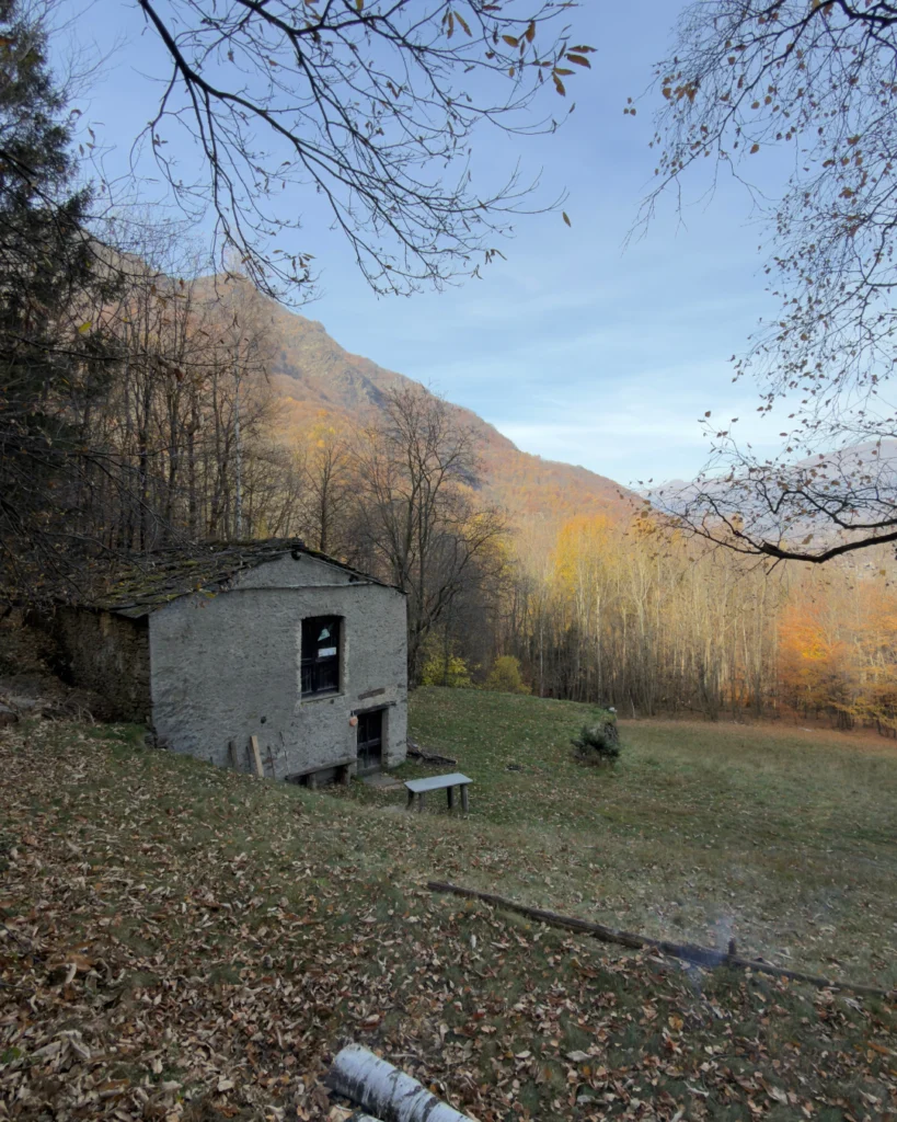 Dopo una lunga salita a spezzare il fiato sulle alture di San Germano Chisone, lungo sentieri in mezzo al bosco, arriviamo ad un pianoro chiamato Pra Pons. Qui si trova un casotto degli alpini, testimonianza storica di quanto erano vissute queste valli e un piccolo abbeveratoio. Da qui, una bellissima vista su Villar Perosa con il suo colorato campanile, e su tutte le montagne circostanti della Val Chisone tinte di arancione.