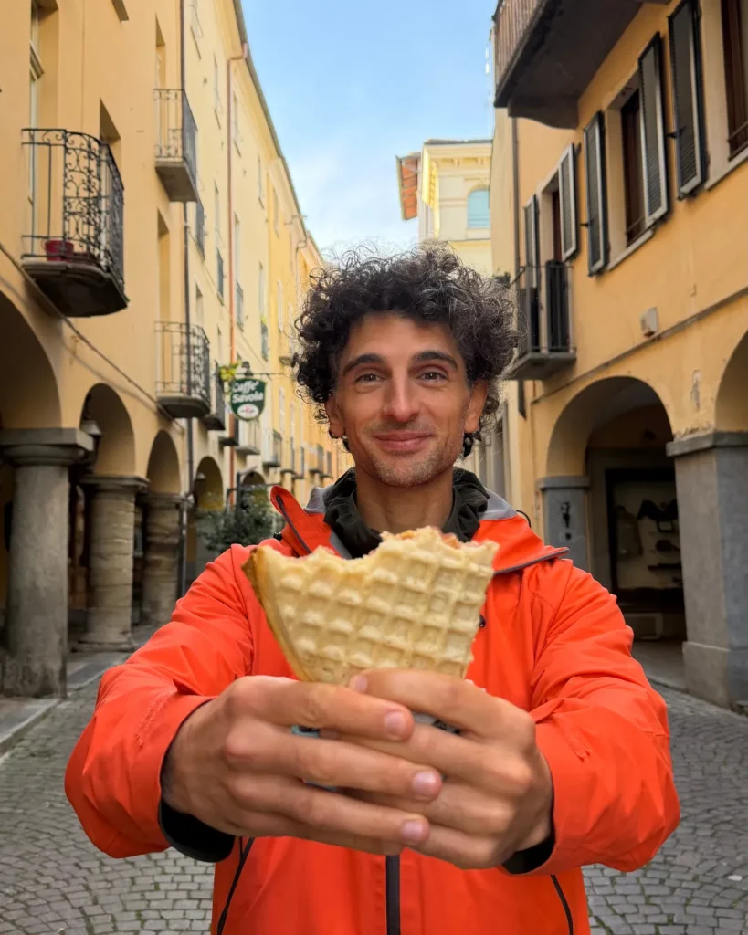 Per pranzo, incontro ravvicinato con il gofri: una cialda sottile e leggera, simile a un waffle ma più croccante, cotta in una pesante piastra di ghisa chiamata gofrera. È uno di quei cibi semplici che ti restano impressi: pochi ingredienti, tanta sostanza. Dopo il gofri, però, non ho più scuse. Per rendere felice Vincenzo finiamo dentro la Caffetteria Castino per “un dolcetto veloce” prima di salire verso la collina.