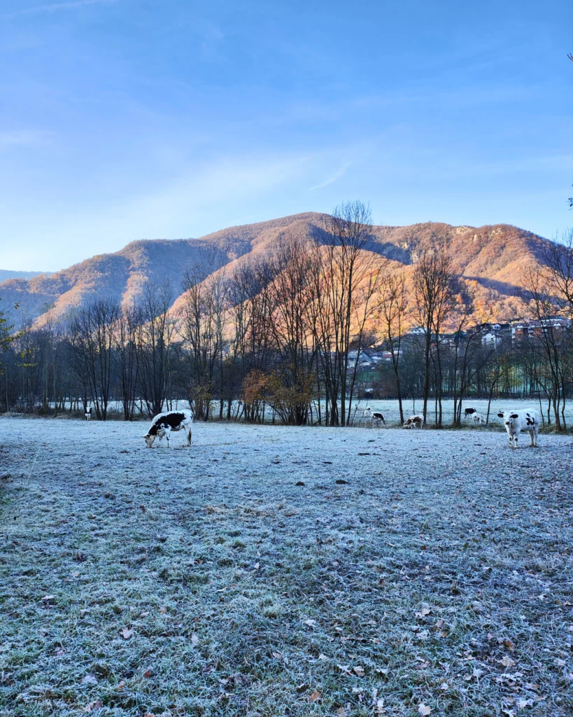 Ieri sera il sonno ha preso il sopravvento e siamo crollati abbastanza presto. Il tempo di fare colazione e di farci riaccompagnare al punto di partenza dal gentilissimo signore che ci ha ospitato nella sua struttura e la tappa di oggi inizia. Una mattinata abbastanza fredda, lo notiamo dalla brina che copre i prati e le mucche che ci guardano curiose lungo il sentiero Verdeacqua, che segue il corso del fiume Chisone.
