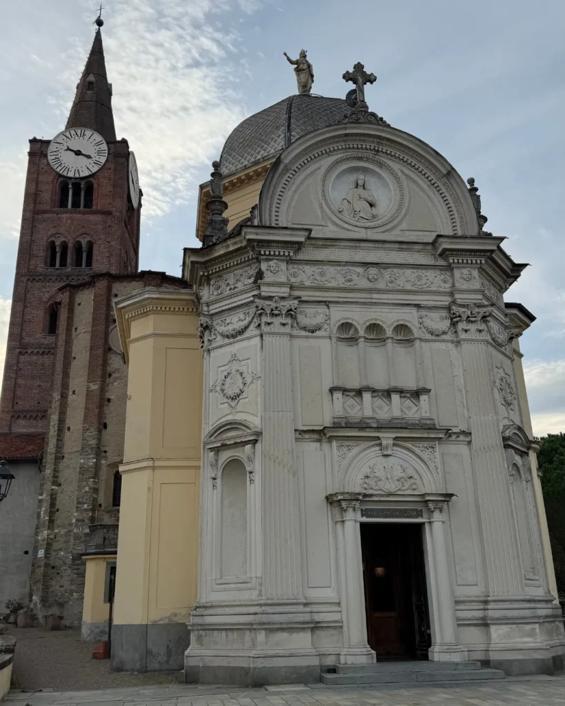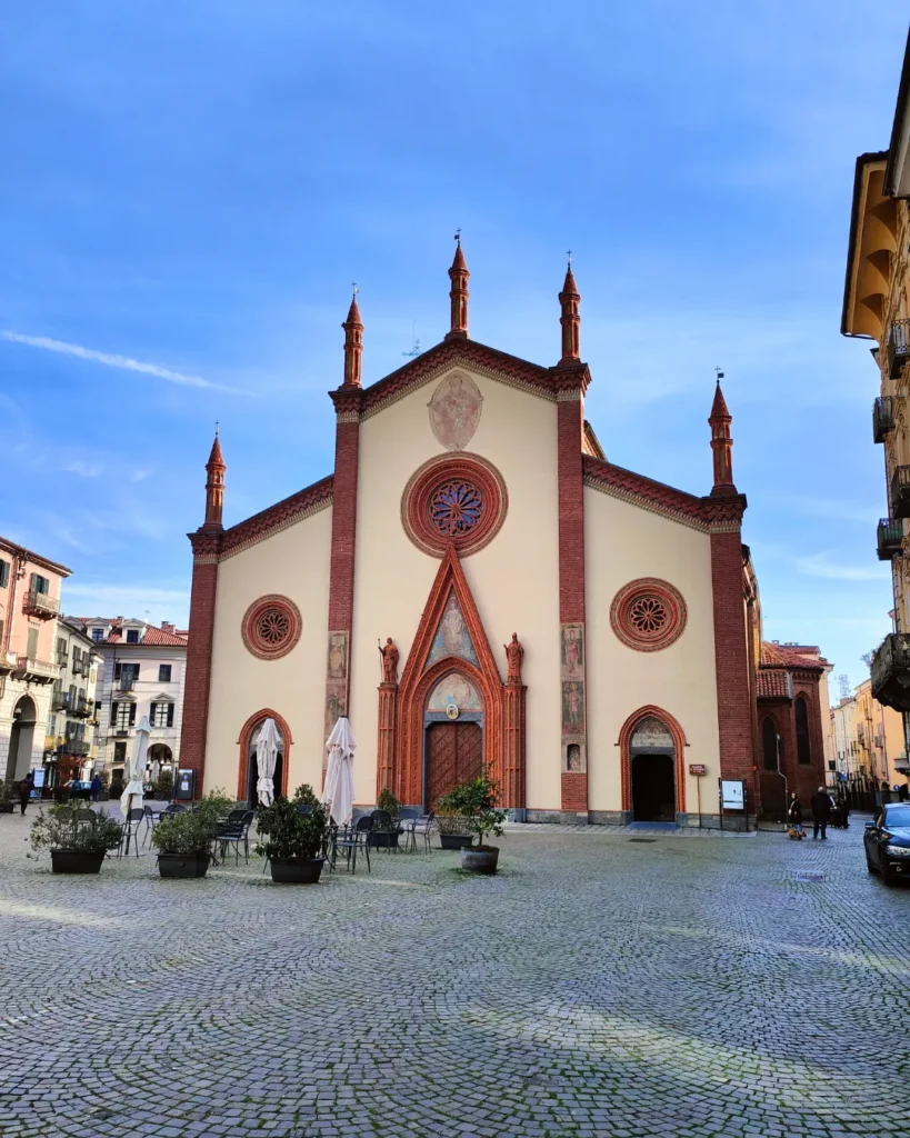 Come biglietto da visita non è male. E infatti la prima impressione mantiene le promesse: tra vicoli silenziosi ci troviamo di fronte la Cattedrale di San Donato, con i suoi colori particolari e le raffigurazioni in facciata. Subito Vincenzo, da buon intenditore di enogastronomia, punta con lo sguardo un’antica pasticceria… ma non è ancora il momento di fermarsi. Prima il dovere, poi il piacere. Dritti verso l’ufficio turistico di Pinerolo per ritirare la credenziale e dare il via ufficiale al cammino.