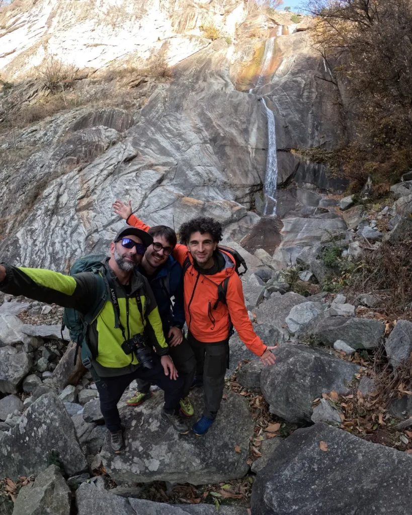 Da buon precisino quale sono obbligo i miei amici a partire una mezz’ora prima. Billo ne è entusiasta dato che vuole arrivare per l’ora di pranzo, per poter riuscire a volare e fare le riprese sul forte con la giusta luce. Come biasimarlo. Partiti con un passo molto svelto una deviazione ci coglie di sorpresa. Un cartello con la scritta “Cascata della Pissa” non lascia spazio a dubbi o interpretazioni, si va! Ci infiliamo nel sentiero e in poco arriviamo davanti alla cascata. Non è nel suo massimo splendore d’acqua, ma il suo fascino ce l’ha eccome. Dronata, foto di gruppo e via di nuovo in cammino.