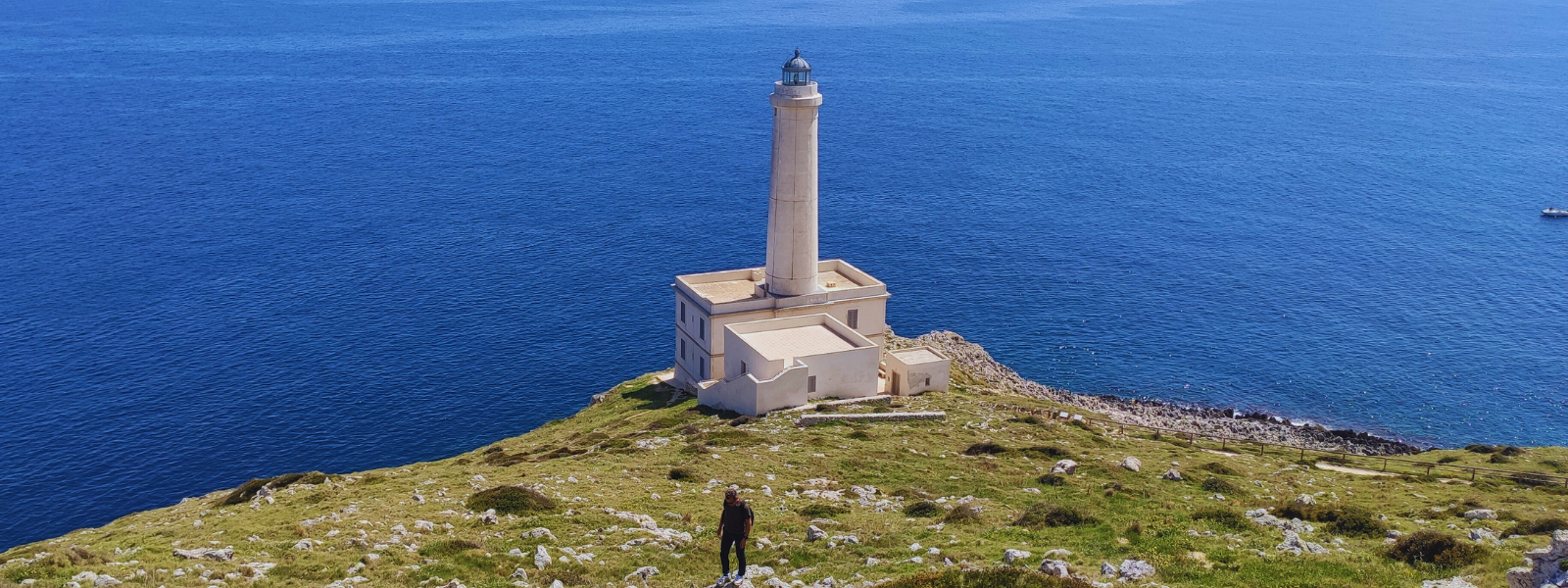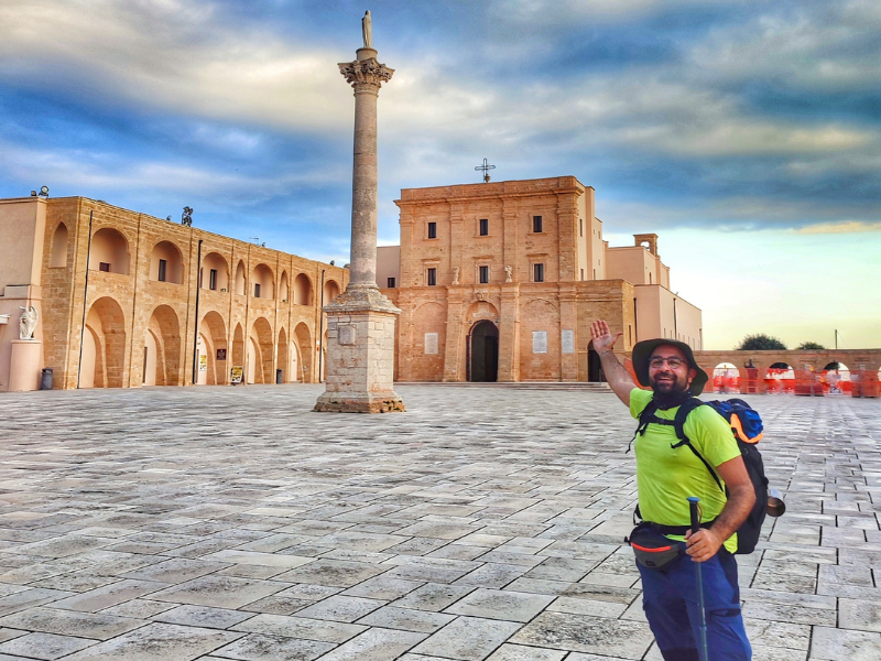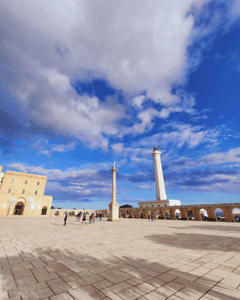 Il cammino si conclude con un morbido percorso nella campagna, per giungere, attraverso il porto, a Santa Maria di Leuca. Lì ci aspetta l’ultima fatica: la scalinata di 283 gradini (dicono) che porta al santuario. In cima, una vasta piazza con l’obelisco al centro. Come quinta, la chiesa di Santa Maria de Finibus Terrae e una sequenza di archi. È il momento dell’ultimo timbro e delle foto di gruppo. Ci sono Marco, Claudia, Franca, Clara, Sofia, Benedetto e la sua compagna. Il giallo della pietra pugliese. L’azzurro del cielo. Il bianco del faro. Bianco come il colore che dà il nome a questa parte di mondo dove la terra finisce.
