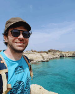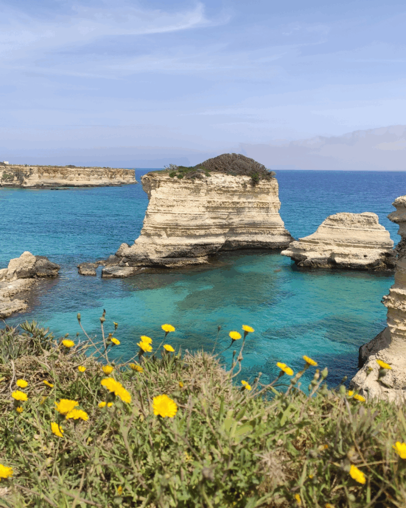 Come spesso accade, le delusioni sono l’anticamera per la soprese più incredibili. Arrivato via mare a Torre dell’Orso, scopro uno dei luoghi più affascinanti della Puglia, una sequenza di scogliere a picco bordate da fiori gialli su un mare azzurrissimo che non ha bisogno di filtri Instagram. La versione mediterranea delle celebri Cliff of Moher irlandesi. Il colore dell’acqua è identico a quello della mia maglietta, che ho ricevuto al Festival dei Cammini 2025.