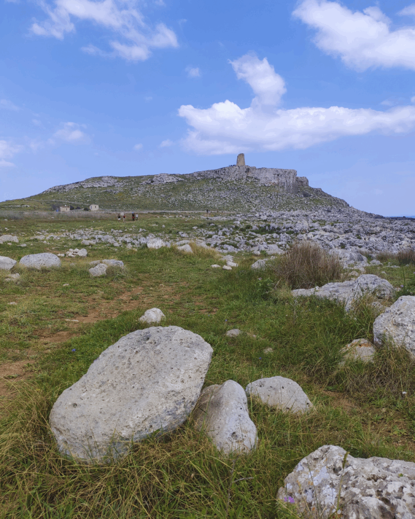 Si riparte lungo spiagge e promontori fino alla torre di avvistamento di Sant’Emiliano. Mi concedo una pausa. Da qui la vista spazia a 360° tra la costa e i campi dell’entroterra perimetrati da muretti a secco. Quando riprendo il percorso il cielo si fa fosco. Guardo indietro la sagoma della torre sul dolce profilo del promontorio sotto il cielo ceruleo, dietro una distesa di vegetazione e qualche masso gigante. Mi trovo sulle Highlands scozzesi?