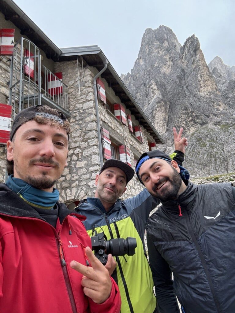 Dopo questo momento di pura emozione, riprendiamo la discesa verso il Rifugio Pradidali. Il cielo, però, non ci dà tregua: poche centinaia di metri prima dell’arrivo, il diluvio ci sorprende. La pioggia cade incessante e trasforma il sentiero in un percorso difficile e scivoloso. Il passo si fa lento e cauto, e ogni metro percorso diventa una piccola vittoria.