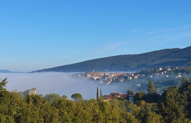 Per fortuna, ci sono i nostri amati frutti di corbezzolo a donarci energia. È stata la salita più difficile di questi giorni. Una volta conclusa, pensiamo solo al pranzo. Attraversiamo il grazioso paesino di Scoppieto. Qui incontriamo Guido, il più anziano del borgo, detto anche il “Galletto”. Con il suo bastone ci indica quello che volevamo sentirci dire: “Vi manca poco a Civitella, è quella laggiù”.