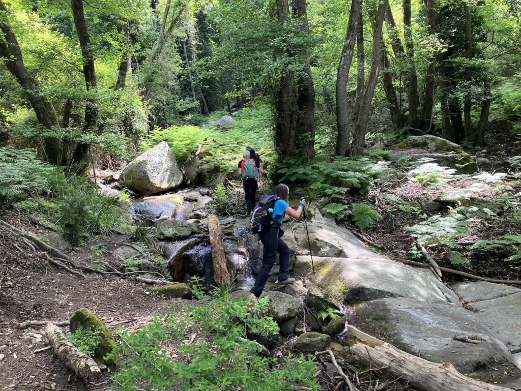 Il sentiero diventa più sconnesso e spesso sparisce tra fronde e massi, mentre il bosco si infittisce. La luce che filtra tra i rami colora l’aria di verde e crea un ambiente avvolgente e intimo, in cui mi sento una visitatrice gradita. Ci inerpichiamo su alcuni sassi cercando tracce del sentiero ma presto ci troviamo circondati da cespugli: il sentiero si è perso, inglobato nel bosco. Mi accorgo che l’unico modo per superare il piccolo ammasso di pietre è raggirarlo, arrampicandosi per un breve tratto lungo i suoi margini, tra fessure e spuntoni. Ancora pochi passi sommersi dalla folta vegetazione, ed ecco che il cammino può riprendere tranquillamente.