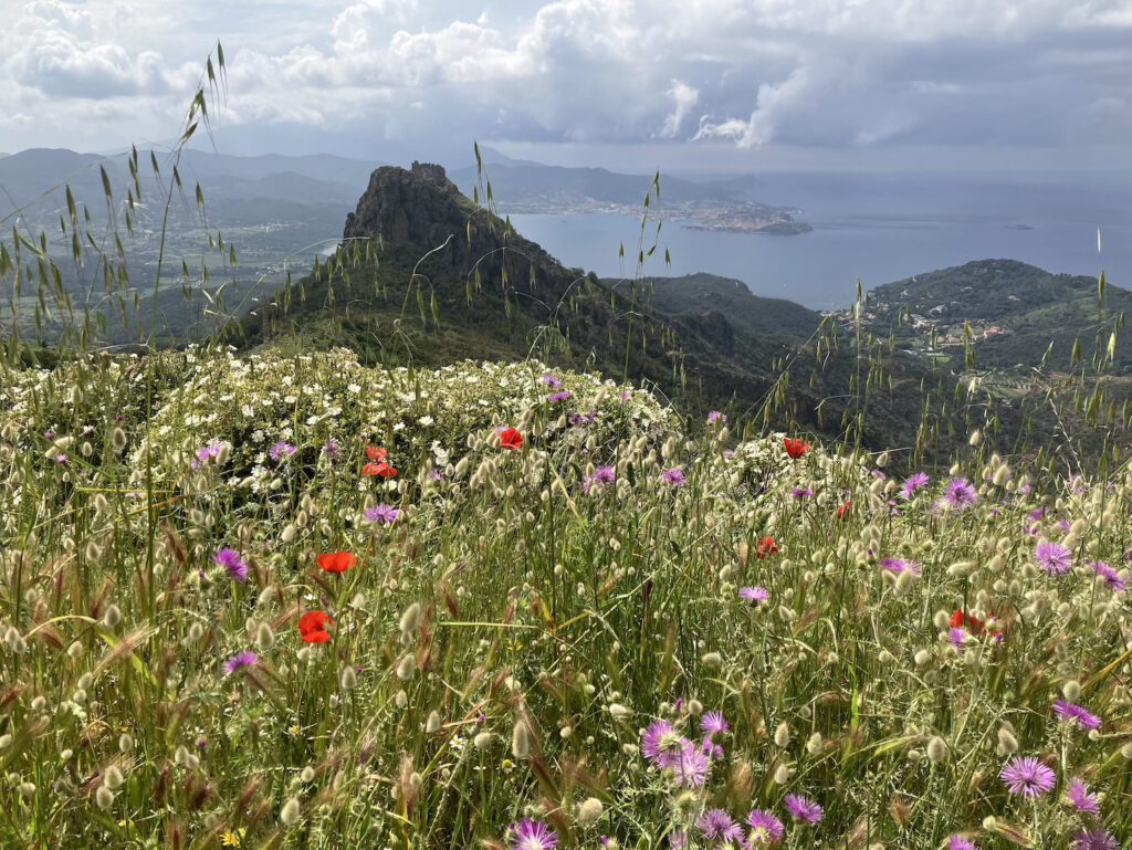 La fioritura è al culmine ora, a metà maggio. Cespugli punteggiati di bianco, giallo, rosa e poi il rosso dei papaveri. È soprattutto questa vegetazione florida che si esprime in colori, forme dalle geometrie precise o imprevedibilmente sinuose, fragranze distintive e armoniose che mi stupisce già dal primo giorno sui monti dell’Elba e continuerà a meravigliarmi e a riempirmi di gioia anche nei prossimi giorni. E poi questo sentirmi in montagna e al mare nello stesso momento, la sensazione pacificante di maggiore prossimità alla completezza.