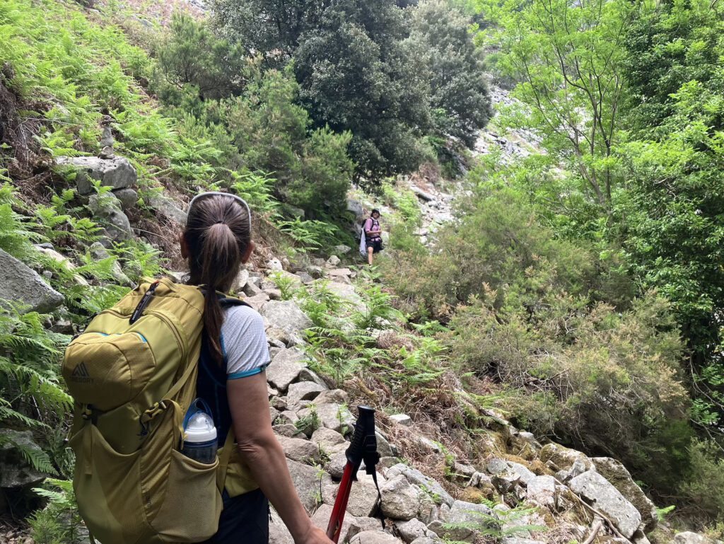 Mattino presto, ci incamminiamo verso sud in direzione di Pomonte, costeggiando per un buon tratto il mare. Il paese non si è ancora svegliato, qualcuno si affaccia a una finestra, un uomo legge il giornale seduto su una panchina. Faccio scorta d’acqua a una fontana in paese, poi ci dirigiamo di nuovo verso le montagne per percorrere una parte della GTE meridionale. Inizialmente, il sentiero si snoda di nuovo in un giardino naturale di arbusti fioriti, è facile, qua e là sassoso. Salendo dolcemente, la vegetazione cambia, e gradatamente entriamo in un bosco.