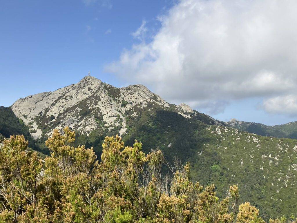 Il Monte Capanne è vicino e mi chiama. Lo trovo bello. È una presenza distintiva, si stacca dal paesaggio che lo circonda per fattezze e colori. Da qui, lo vedo in parte ricoperto di un bosco fitto, verde scuro che, quasi d’improvviso, lascia spazio alla roccia. Le sue pendici diventano allora biancastre, si distendono e quindi, più o meno centralmente, si increspano nella vetta quasi triangolare che domina tutta l’isola.