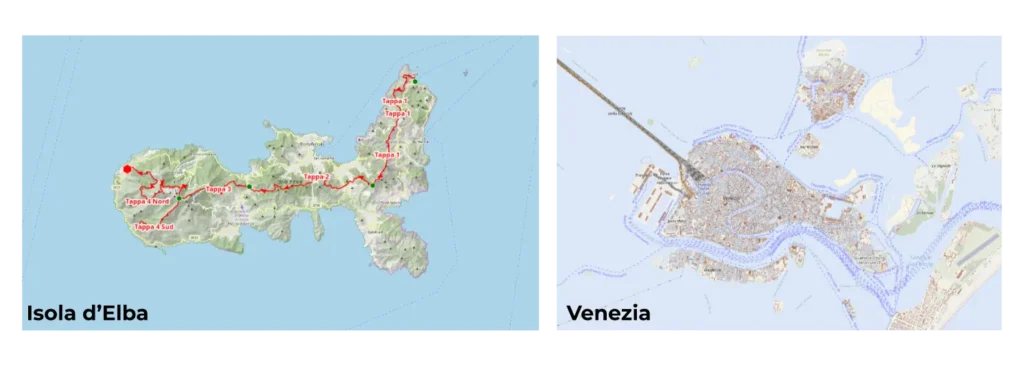 Anche l’isola d’Elba è un pesce, come la mia amata Venezia, a me connaturata, che mai mi tradisce, né io, tantomeno, lei. Innamoramento infinito, connubio innato. Ma avete notato quanto si somigliano nella forma?