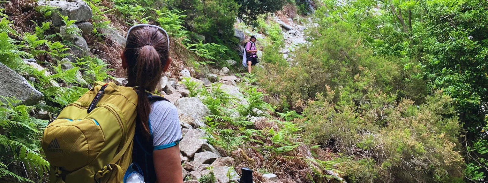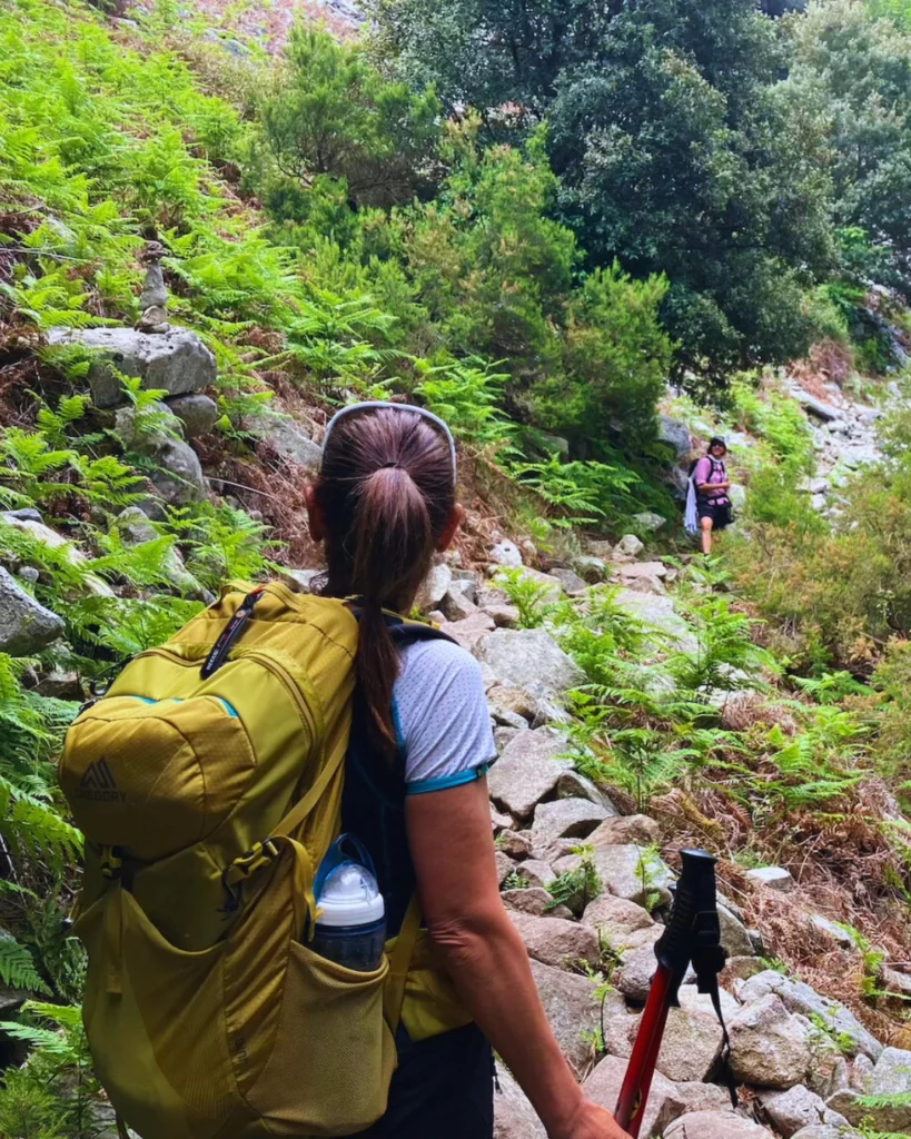 Mattino presto, ci incamminiamo verso sud in direzione di Pomonte, costeggiando per un buon tratto il mare. Il paese non si è ancora svegliato, qualcuno si affaccia a una finestra, un uomo legge il giornale seduto su una panchina. Faccio scorta d’acqua a una fontana in paese, poi ci dirigiamo di nuovo verso le montagne per percorrere una parte della GTE meridionale. Inizialmente, il sentiero si snoda di nuovo in un giardino naturale di arbusti fioriti, è facile, qua e là sassoso. Salendo dolcemente, la vegetazione cambia, e gradatamente entriamo in un bosco.