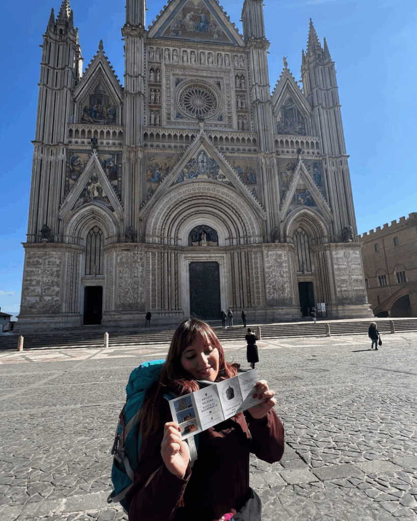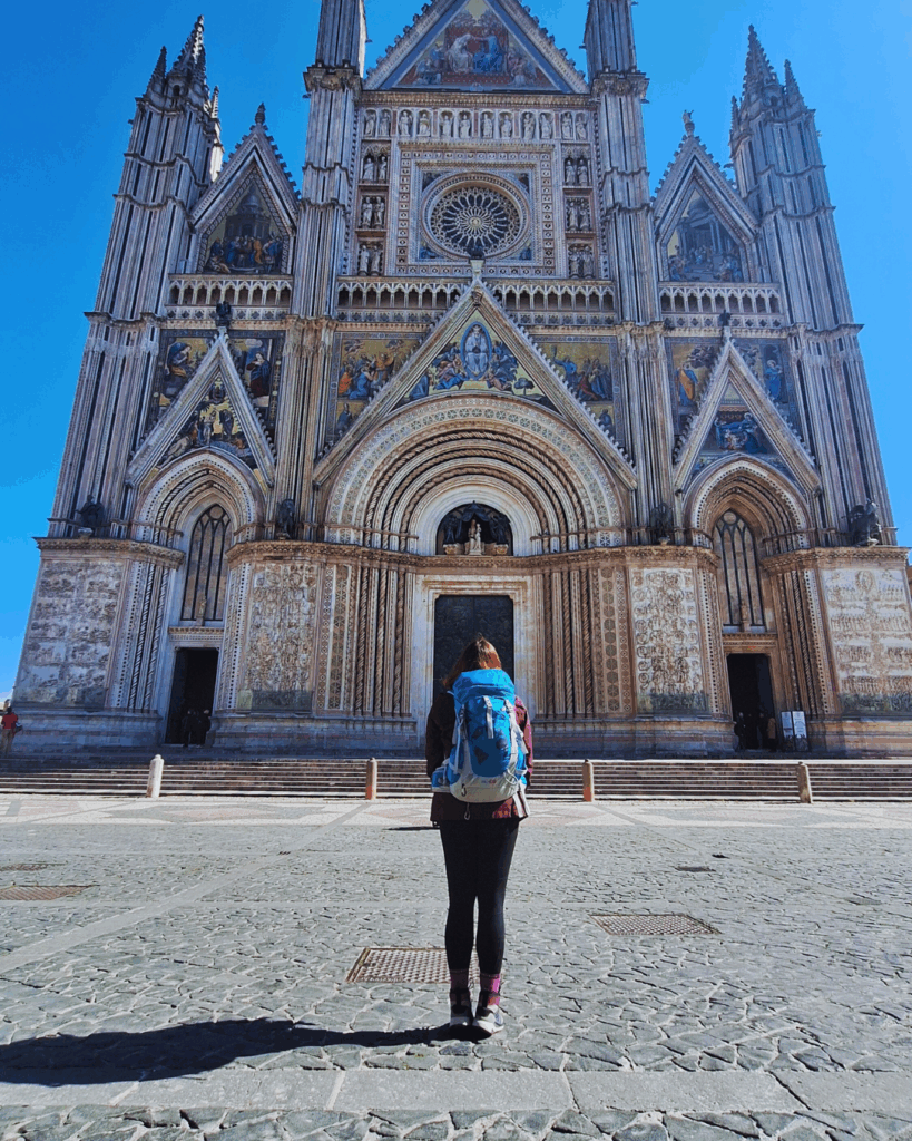 Raggiungo Orvieto in macchina, parcheggiando al parcheggio della funicolare: gratuito, molto sicuro e vicino alla stazione ferroviaria. Con un biglietto urbano da 1,30 €, prendo la funicolare e raggiungo il centro. Sappiate che, se non volete guidare, Orvieto è comodamente raggiungibile anche in treno. Non fatevi scoraggiare! È mattina, sono in Piazza Duomo, c’è il sole, e sto per partire per un nuovo cammino. Posso chiedere di meglio?