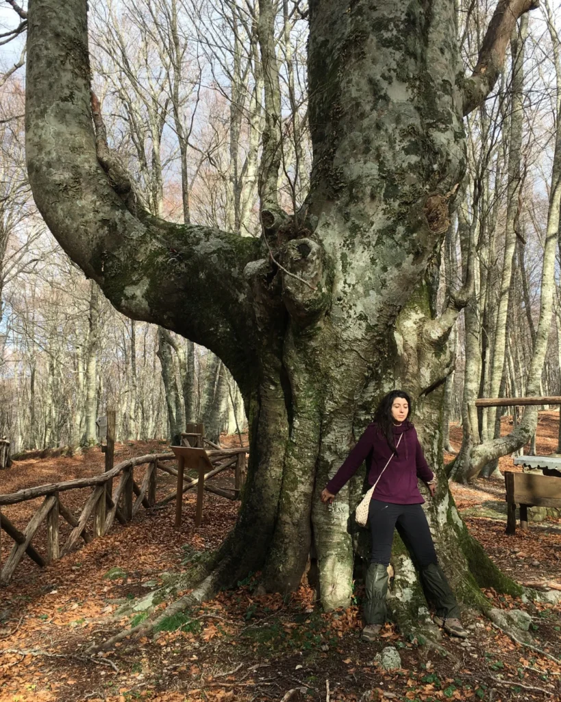 Dopo questa esperienza toccante, proseguiamo lungo il sentiero. Lasciamo il bosco di castagni e ci addentriamo in una faggeta infinita. Lungo il cammino troviamo aree da picnic e sorgenti d’acqua, ma non ancora il nostro obiettivo: il Faggio di San Francesco. Si tratta di un albero di almeno 600 anni, sotto il quale Francesco si riparava durante i suoi spostamenti da San Marco a Paola. Dopo aver camminato a lungo nella faggeta, ammirando i giochi di luce tra i rami e il vento che li culla come fosse un mare, finalmente arriviamo all’area sacra dove si trova il Faggio di San Francesco.