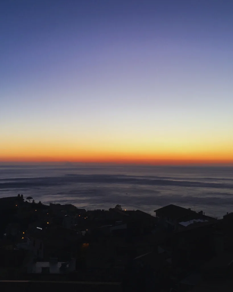 Arriviamo infine al rifugio del Bosco di Cinquemiglia di Fuscaldo, chiuso durante il periodo invernale. Qui ci aspetta Piero, che ci accompagna in auto fino a Fuscaldo, a circa 10 km di distanza. Durante il tragitto, Piero ci racconta del borgo dei cento portali, sede della scuola di scalpellini e città natale di Vienna, madre di Francesco. Dopo aver lasciato gli zaini nel nostro alloggio, ci affrettiamo a uscire per non perdere il tramonto sul mare. Lo spettacolo del sole che cala dietro lo Stromboli è mozzafiato.