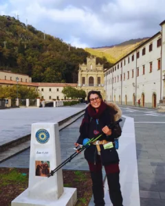 Arrivate in paese, ci dirigiamo verso il santuario, passando da un ponticello che sembra un confine tra il mondo naturale e quello urbano. L’emozione cresce quando vediamo il santuario da vicino. Sul cippo del km 0 leggiamo una frase di San Francesco: “Per carità, devi venire più spesso da queste parti”. Visitiamo il santuario, ritiriamo il Testimonium e ci sentiamo piene di gratitudine. Anche se non siamo riuscite a incontrare tutti i referenti di tappa, sapere che ci sono persone dedicate a promuovere questi luoghi ci riempie di speranza.