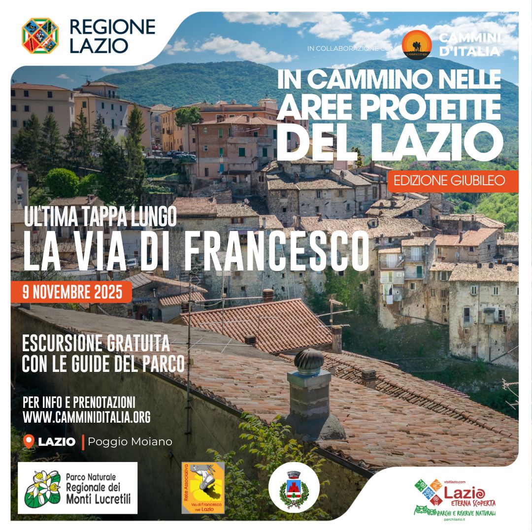 Nel tratto laziale, il cammino incontra il Parco dei Monti Lucretili, seguendo antichi sentieri tra boschi, eremi e piccoli centri abitati che hanno mantenuto intatto il legame con la spiritualità francescana.