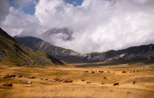 Iniziamo quindi a camminare, immersi nelle nuvole che nel frattempo ci avevano avvolti, finché, dopo aver perso un po’ di quota, il panorama si apre e davanti a noi lo spettacolo è da togliere il fiato: la piana di Campo Imperatore risplende dorata, baciata dal sole che filtra tra le nubi e una mandria numerosissima di mucche riempie la scena di quella che, a tutti gli affetti, ci sembra una riproduzione di qualche prateria americana. Proseguiamo in questo contesto incredibile finché il paesaggio cambia improvvisamente: entriamo in una gola che sembra uscita direttamente dal set di un film western, il Canyon dello Scoppaturo, che è proprio una delle location in cui è stato girato il film “Continuavano a chiamarlo Trinità”.