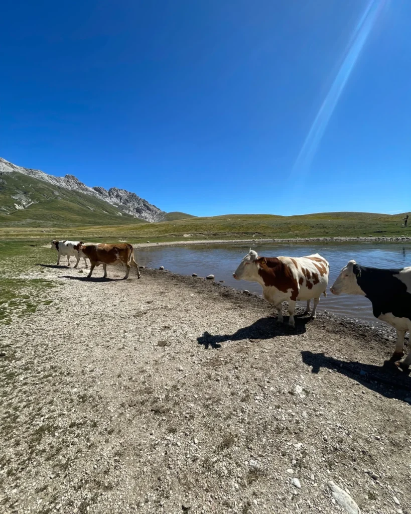 Il sentiero si snoda lungo il fantastico altopiano, passando per il laghetto Pietranzoni, dove trova riposo una mandria di mucche.