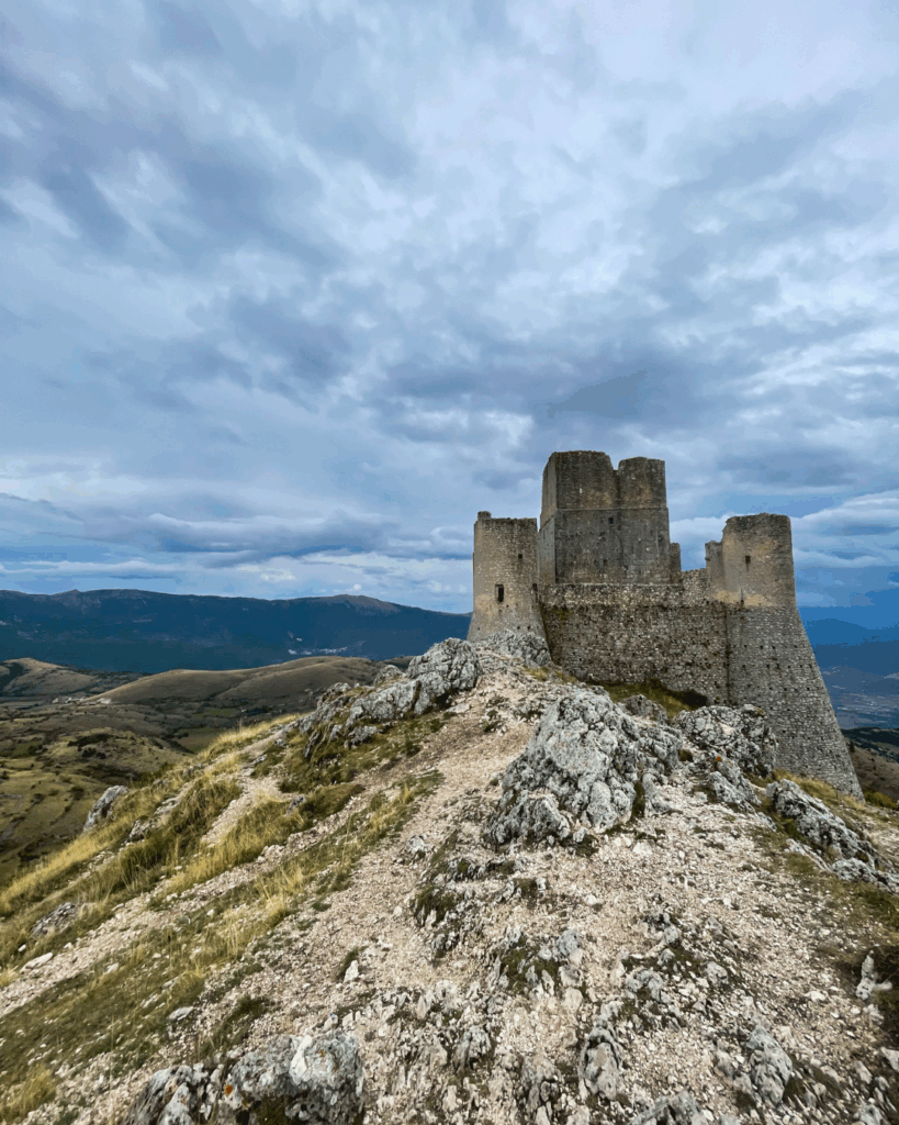 La giornata inizia sotto la pioggia: fiducioso mi dirigo verso Rocca Calascio (a mio avviso uno degli spot più belli del Cammino). Trovo riparo proprio nella taverna sotto la rocca e, in compagnia di qualche arrosticino, aspetto che il tempo migliori. Analizzando il radar meteo riesco a uscire appena la pioggia finisce e, facendo gli ultimi 10 minuti di sentiero, riesco a godermi tutta la rocca in solitaria.