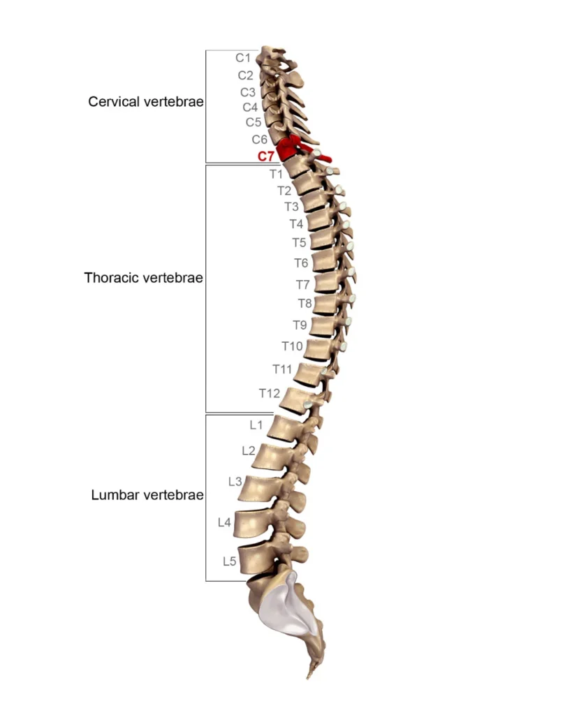 2. Individuata la C7, piegando leggermente avanti il collo è quella che “spunta” verso l’esterno, tracceremo una linea perpendicolare, una volta raddrizzato il collo, dalla vertebra alla linea immaginaria delle anche.